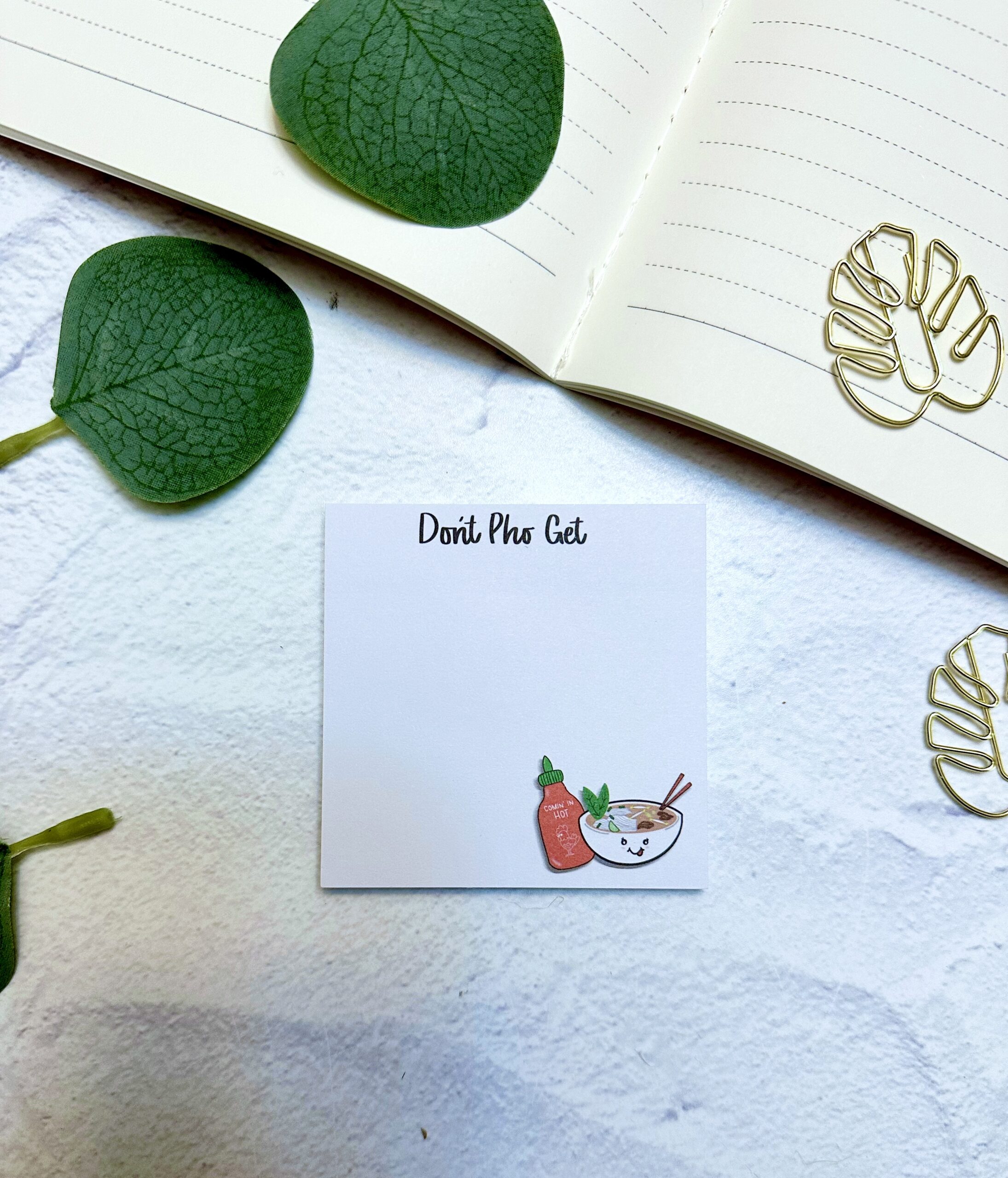 Dont-pho-get-sticky-notes, If you’re looking for a fun and practical way to stay organized, these pho-themed sticky notes are the perfect addition to your desk or planner. Inspired by everyone’s favorite noodle soup, these sticky notes combine adorable illustrations with playful puns that will bring a smile to your face every time you jot something down. Each pad features delightful designs that celebrate the comfort and charm of pho, making them a unique and fun accessory for any noodle lover.