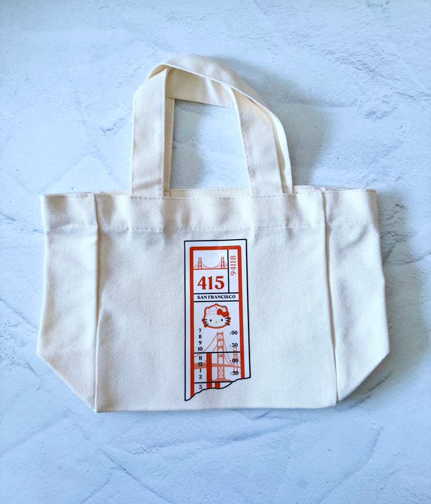 Bright, playful, and full of San Francisco spirit. This adorable canvas mini tote features Hello Kitty paired with a classic orange Muni transfer ticket, blending kawaii cuteness, Bay Area nostalgia, and a subtle SF Giants vibe all in one iconic design.